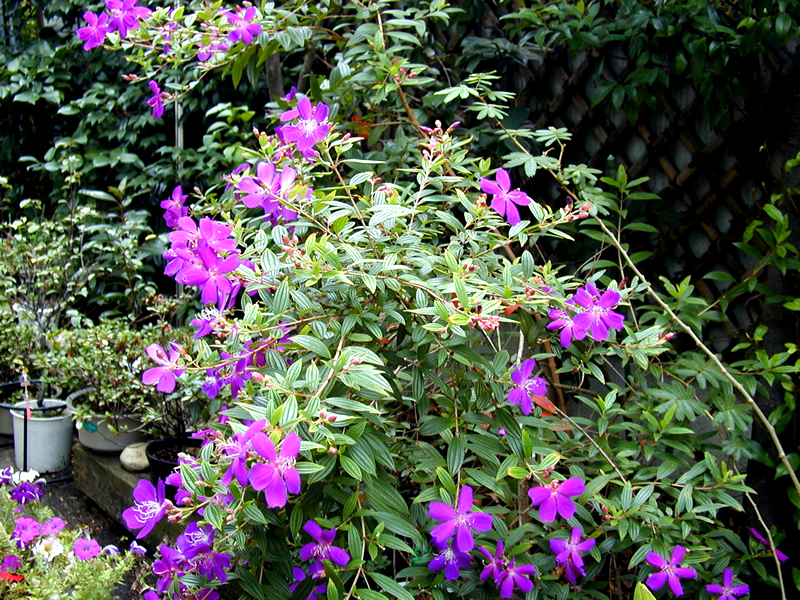 シコンノボタンは晩夏から晩秋まで花期の長い常緑低木です。暑いときより、少し涼しくなって来たときの紫紺の花の色が、私には好もしく感じられます。 日本古来の花の風情ですが、南アメリカ原産です。